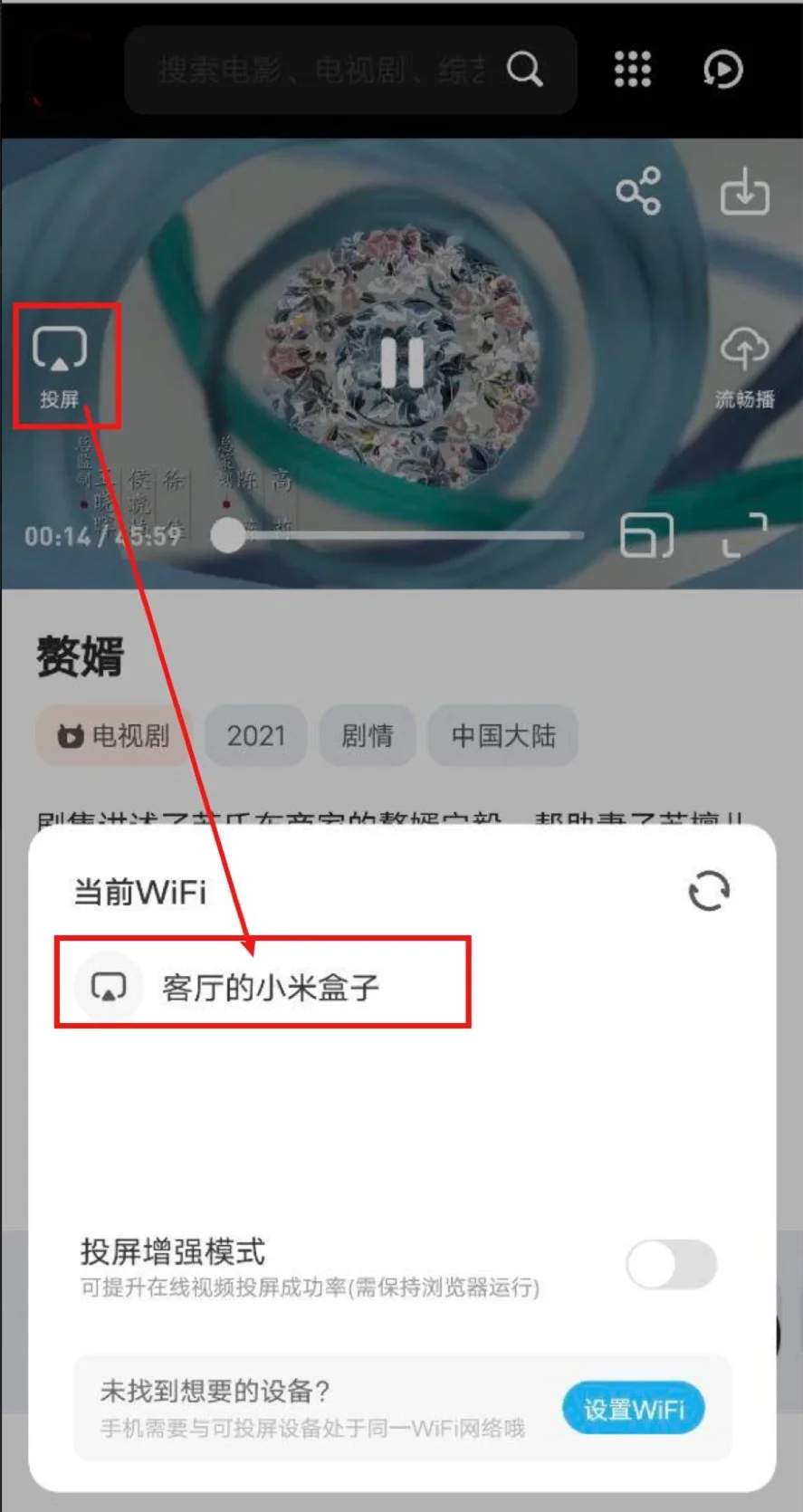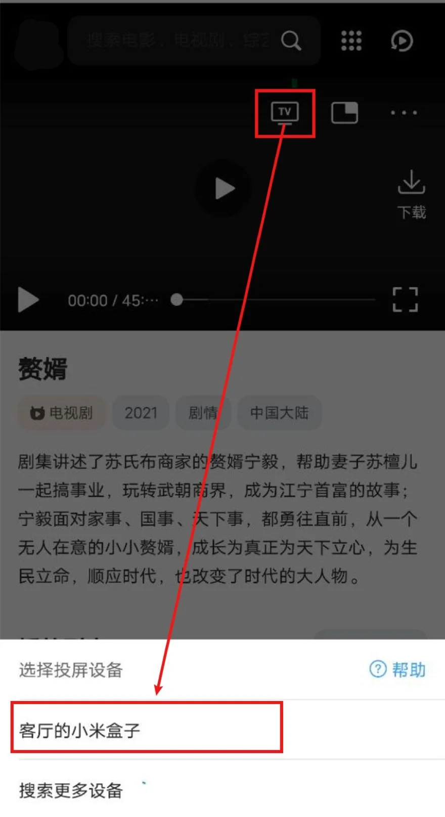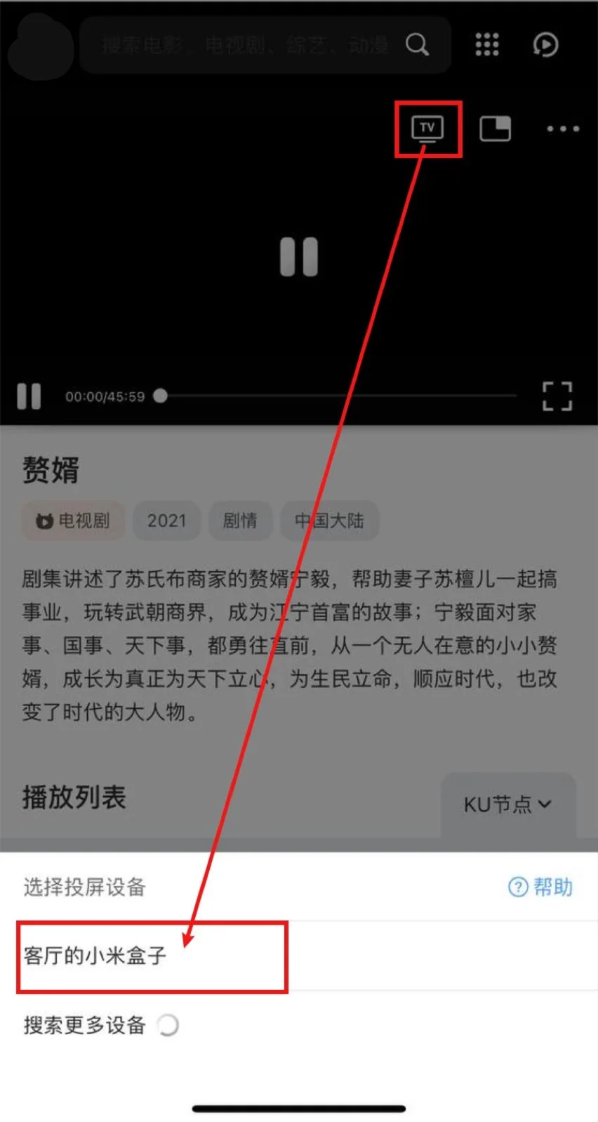 打开QQ浏览器(会接管网页播放器)->打开毅晨影视->播放视频->选中投屏图标->等待搜寻出智能电视/电视盒子->选中,即可投屏。